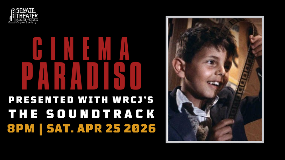 Together with WRCJ’s film score focused radio program “The Soundtrack” the Senate Theater invites you to a special screening of Cinema Paradiso! To celebrate the magic of the movies (and The Soundtrack’s one year anniversary) we’re bringing this international art house sensation and its finely tuned romantic score to the big screen. You’ll be swept away by the ecstatic synthesis of moving pictures and moving melody by Italian master Ennio Morricone and his son Andrea Morricone.