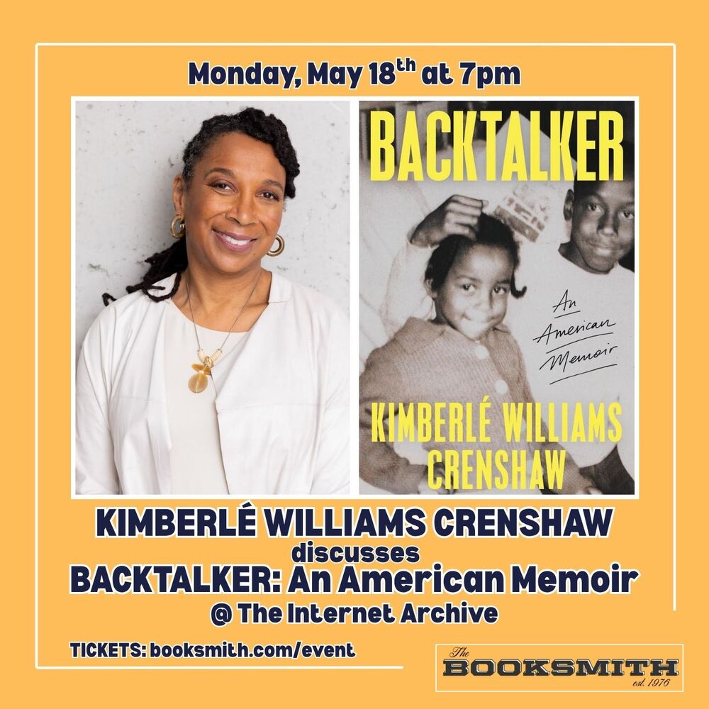 Join us on Monday, May 18th at 7pm as we welcome Kimberlé Williams Crenshaw to San Francisco for Backtalker at The Internet Archive. Tickets are required for this event and can be purchased at the link above.