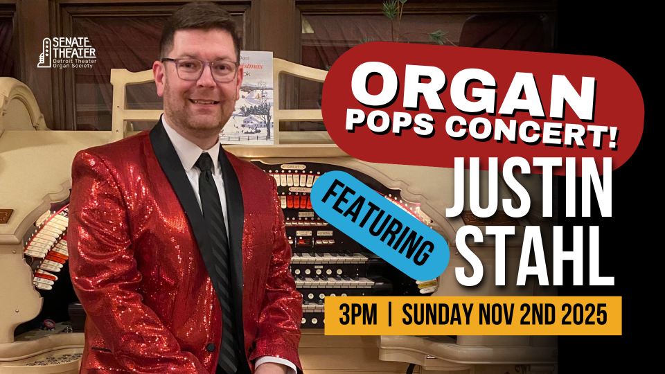 The Detroit Theater Organ Society’s long running Organ Pops Concert series continues the 2025 season with yet another afternoon of songs and splendor at the Senate. This time around we’re combining the power of our Mighty Wurlitzer theater organ, (the eighth largest ever constructed) with the diverse musical talents of organist, Justin Stahl! Don’t miss your chance to experience the majesty, nuance and diversity of sounds that only a theater pipe organ can provide.